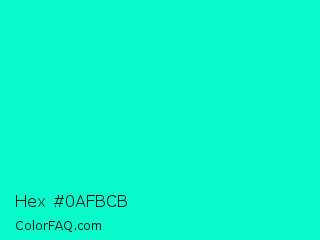 Hex #0afbcb Color is a normal cyan color and the nearest color is Bright Turquoise #08e8de. Hex code #0afbcb and RGB value is rgb(10,251,203). In RGB color space, this color is composed of 4% red, 98% green, 80% blue, In CMYK color space, this color is composed of 96% cyan, 0% magenta, 19% yellow , 2% black , In HSL color space, this color has a hue angle of 168° , 97% saturation and 51% lightness.