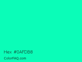 Hex #0afdb8 Color is a normal green color and the nearest color is Medium Spring Green #00fa9a. Hex code #0afdb8 and RGB value is rgb(10,253,184). In RGB color space, this color is composed of 4% red, 99% green, 72% blue, In CMYK color space, this color is composed of 96% cyan, 0% magenta, 27% yellow , 1% black , In HSL color space, this color has a hue angle of 163° , 98% saturation and 52% lightness.