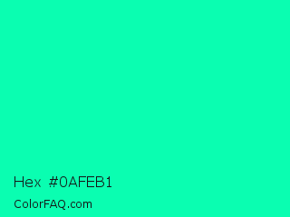 Hex #0afeb1 Color is a normal green color and the nearest color is Medium Spring Green #00fa9a. Hex code #0afeb1 and RGB value is rgb(10,254,177). In RGB color space, this color is composed of 4% red, 100% green, 69% blue, In CMYK color space, this color is composed of 96% cyan, 0% magenta, 30% yellow , 0% black , In HSL color space, this color has a hue angle of 161° , 99% saturation and 52% lightness.