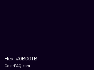 Hex #0b001b Color is a almost black violet color and the nearest color is Black Russian #0a001c. Hex code #0b001b and RGB value is rgb(11,0,27). In RGB color space, this color is composed of 4% red, 0% green, 11% blue, In CMYK color space, this color is composed of 59% cyan, 100% magenta, 0% yellow , 89% black , In HSL color space, this color has a hue angle of 264° , 100% saturation and 5% lightness.