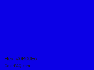 Hex #0b00e6 Color is a normal indigo color and the nearest color is Medium Blue #0000cd. Hex code #0b00e6 and RGB value is rgb(11,0,230). In RGB color space, this color is composed of 4% red, 0% green, 90% blue, In CMYK color space, this color is composed of 95% cyan, 100% magenta, 0% yellow , 10% black , In HSL color space, this color has a hue angle of 243° , 100% saturation and 45% lightness.