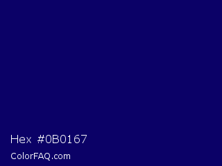 Hex #0b0167 Color is a very dark indigo color and the nearest color is Arapawa #110c6c. Hex code #0b0167 and RGB value is rgb(11,1,103). In RGB color space, this color is composed of 4% red, 0% green, 40% blue, In CMYK color space, this color is composed of 89% cyan, 99% magenta, 0% yellow , 60% black , In HSL color space, this color has a hue angle of 246° , 98% saturation and 20% lightness.