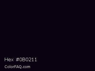 Hex #0b0211 Color is a almost black purple color and the nearest color is Jaguar #080110. Hex code #0b0211 and RGB value is rgb(11,2,17). In RGB color space, this color is composed of 4% red, 1% green, 7% blue, In CMYK color space, this color is composed of 35% cyan, 88% magenta, 0% yellow , 93% black , In HSL color space, this color has a hue angle of 276° , 79% saturation and 4% lightness.