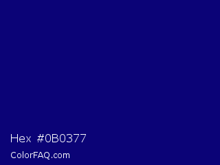 Hex #0b0377 Color is a dark indigo color and the nearest color is Navy Blue #000080. Hex code #0b0377 and RGB value is rgb(11,3,119). In RGB color space, this color is composed of 4% red, 1% green, 47% blue, In CMYK color space, this color is composed of 91% cyan, 97% magenta, 0% yellow , 53% black , In HSL color space, this color has a hue angle of 244° , 95% saturation and 24% lightness.