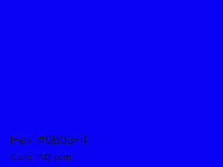 Hex #0b03f4 Color is a normal indigo color and the nearest color is Blue #0000ff. Hex code #0b03f4 and RGB value is rgb(11,3,244). In RGB color space, this color is composed of 4% red, 1% green, 96% blue, In CMYK color space, this color is composed of 95% cyan, 99% magenta, 0% yellow , 4% black , In HSL color space, this color has a hue angle of 242° , 98% saturation and 48% lightness.