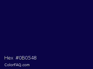 Hex #0b0548 Color is a very dark indigo color and the nearest color is Stratos #000741. Hex code #0b0548 and RGB value is rgb(11,5,72). In RGB color space, this color is composed of 4% red, 2% green, 28% blue, In CMYK color space, this color is composed of 85% cyan, 93% magenta, 0% yellow , 72% black , In HSL color space, this color has a hue angle of 245° , 87% saturation and 15% lightness.