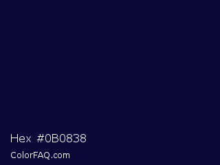 Hex #0b0838 Color is a very dark indigo color and the nearest color is Black Rock #0d0332. Hex code #0b0838 and RGB value is rgb(11,8,56). In RGB color space, this color is composed of 4% red, 3% green, 22% blue, In CMYK color space, this color is composed of 80% cyan, 86% magenta, 0% yellow , 78% black , In HSL color space, this color has a hue angle of 244° , 75% saturation and 13% lightness.