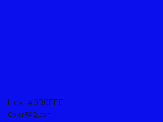 Hex #0b0fee Color is a normal blue color and the nearest color is Bluebonnet #1c1cf0. Hex code #0b0fee and RGB value is rgb(11,15,238). In RGB color space, this color is composed of 4% red, 6% green, 93% blue, In CMYK color space, this color is composed of 95% cyan, 94% magenta, 0% yellow , 7% black , In HSL color space, this color has a hue angle of 239° , 91% saturation and 49% lightness.