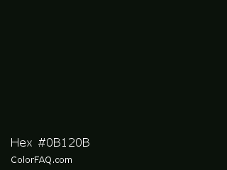 Hex #0b120b Color is a almost black green color and the nearest color is Gordons Green #0b1107. Hex code #0b120b and RGB value is rgb(11,18,11). In RGB color space, this color is composed of 4% red, 7% green, 4% blue, In CMYK color space, this color is composed of 39% cyan, 0% magenta, 39% yellow , 93% black , In HSL color space, this color has a hue angle of 120° , 24% saturation and 6% lightness.