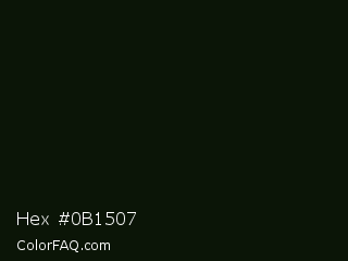 Hex #0b1507 Color is a almost black green color and the nearest color is Black Forest #0b1304. Hex code #0b1507 and RGB value is rgb(11,21,7). In RGB color space, this color is composed of 4% red, 8% green, 3% blue, In CMYK color space, this color is composed of 48% cyan, 0% magenta, 67% yellow , 92% black , In HSL color space, this color has a hue angle of 103° , 50% saturation and 5% lightness.