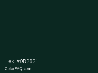 Hex #0b2821 Color is a very dark cyan color and the nearest color is Bush #0d2e1c. Hex code #0b2821 and RGB value is rgb(11,40,33). In RGB color space, this color is composed of 4% red, 16% green, 13% blue, In CMYK color space, this color is composed of 73% cyan, 0% magenta, 18% yellow , 84% black , In HSL color space, this color has a hue angle of 166° , 57% saturation and 10% lightness.