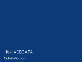Hex #0b3a7a Color is a dark blue color and the nearest color is Dark Cerulean #08457e. Hex code #0b3a7a and RGB value is rgb(11,58,122). In RGB color space, this color is composed of 4% red, 23% green, 48% blue, In CMYK color space, this color is composed of 91% cyan, 52% magenta, 0% yellow , 52% black , In HSL color space, this color has a hue angle of 215° , 83% saturation and 26% lightness.