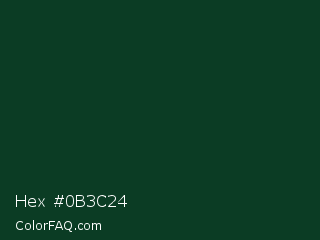 Hex #0b3c24 Color is a very dark green color and the nearest color is Bottle Green #093624. Hex code #0b3c24 and RGB value is rgb(11,60,36). In RGB color space, this color is composed of 4% red, 24% green, 14% blue, In CMYK color space, this color is composed of 82% cyan, 0% magenta, 40% yellow , 76% black , In HSL color space, this color has a hue angle of 151° , 69% saturation and 14% lightness.