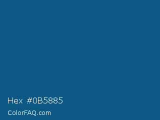 Hex #0b5885 Color is a dark blue color and the nearest color is Venice Blue #055989. Hex code #0b5885 and RGB value is rgb(11,88,133). In RGB color space, this color is composed of 4% red, 35% green, 52% blue, In CMYK color space, this color is composed of 92% cyan, 34% magenta, 0% yellow , 48% black , In HSL color space, this color has a hue angle of 202° , 85% saturation and 28% lightness.
