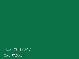 Hex #0b7247 Color is a dark green color and the nearest color is Jewel #126b40. Hex code #0b7247 and RGB value is rgb(11,114,71). In RGB color space, this color is composed of 4% red, 45% green, 28% blue, In CMYK color space, this color is composed of 90% cyan, 0% magenta, 38% yellow , 55% black , In HSL color space, this color has a hue angle of 155° , 82% saturation and 25% lightness.