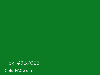 Hex #0b7c23 Color is a dark green color and the nearest color is La Salle Green #087830. Hex code #0b7c23 and RGB value is rgb(11,124,35). In RGB color space, this color is composed of 4% red, 49% green, 14% blue, In CMYK color space, this color is composed of 91% cyan, 0% magenta, 72% yellow , 51% black , In HSL color space, this color has a hue angle of 133° , 84% saturation and 26% lightness.