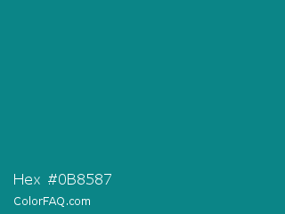 Hex #0b8587 Color is a dark cyan color and the nearest color is Metallic Seaweed #0a7e8c. Hex code #0b8587 and RGB value is rgb(11,133,135). In RGB color space, this color is composed of 4% red, 52% green, 53% blue, In CMYK color space, this color is composed of 92% cyan, 1% magenta, 0% yellow , 47% black , In HSL color space, this color has a hue angle of 181° , 85% saturation and 29% lightness.