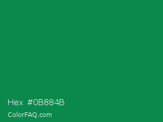 Hex #0b884b Color is a dark green color and the nearest color is Salem #097f4b. Hex code #0b884b and RGB value is rgb(11,136,75). In RGB color space, this color is composed of 4% red, 53% green, 29% blue, In CMYK color space, this color is composed of 92% cyan, 0% magenta, 45% yellow , 47% black , In HSL color space, this color has a hue angle of 151° , 85% saturation and 29% lightness.