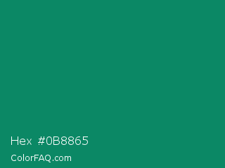 Hex #0b8865 Color is a dark green color and the nearest color is Elf Green #088370. Hex code #0b8865 and RGB value is rgb(11,136,101). In RGB color space, this color is composed of 4% red, 53% green, 40% blue, In CMYK color space, this color is composed of 92% cyan, 0% magenta, 26% yellow , 47% black , In HSL color space, this color has a hue angle of 163° , 85% saturation and 29% lightness.