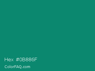 Hex #0b886f Color is a dark cyan color and the nearest color is Elf Green #088370. Hex code #0b886f and RGB value is rgb(11,136,111). In RGB color space, this color is composed of 4% red, 53% green, 44% blue, In CMYK color space, this color is composed of 92% cyan, 0% magenta, 18% yellow , 47% black , In HSL color space, this color has a hue angle of 168° , 85% saturation and 29% lightness.