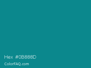 Hex #0b888d Color is a dark cyan color and the nearest color is Blue Chill #0c8990. Hex code #0b888d and RGB value is rgb(11,136,141). In RGB color space, this color is composed of 4% red, 53% green, 55% blue, In CMYK color space, this color is composed of 92% cyan, 4% magenta, 0% yellow , 45% black , In HSL color space, this color has a hue angle of 182° , 86% saturation and 30% lightness.
