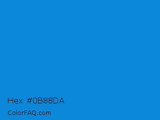 Hex #0b88da Color is a normal blue color and the nearest color is Rich Electric Blue #0892d0. Hex code #0b88da and RGB value is rgb(11,136,218). In RGB color space, this color is composed of 4% red, 53% green, 85% blue, In CMYK color space, this color is composed of 95% cyan, 38% magenta, 0% yellow , 15% black , In HSL color space, this color has a hue angle of 204° , 90% saturation and 45% lightness.