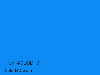 Hex #0b8bf3 Color is a normal blue color and the nearest color is Azure Radiance #007fff. Hex code #0b8bf3 and RGB value is rgb(11,139,243). In RGB color space, this color is composed of 4% red, 55% green, 95% blue, In CMYK color space, this color is composed of 95% cyan, 43% magenta, 0% yellow , 5% black , In HSL color space, this color has a hue angle of 207° , 91% saturation and 50% lightness.