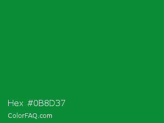 Hex #0b8d37 Color is a dark green color and the nearest color is North Texas Green #059033. Hex code #0b8d37 and RGB value is rgb(11,141,55). In RGB color space, this color is composed of 4% red, 55% green, 22% blue, In CMYK color space, this color is composed of 92% cyan, 0% magenta, 61% yellow , 45% black , In HSL color space, this color has a hue angle of 140° , 86% saturation and 30% lightness.
