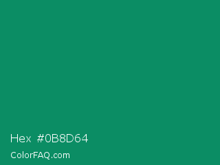 Hex #0b8d64 Color is a dark green color and the nearest color is Observatory #02866f. Hex code #0b8d64 and RGB value is rgb(11,141,100). In RGB color space, this color is composed of 4% red, 55% green, 39% blue, In CMYK color space, this color is composed of 92% cyan, 0% magenta, 29% yellow , 45% black , In HSL color space, this color has a hue angle of 161° , 86% saturation and 30% lightness.