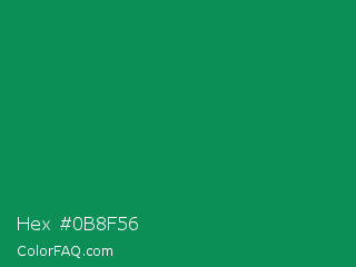 Hex #0b8f56 Color is a dark green color and the nearest color is Spanish Green #009150. Hex code #0b8f56 and RGB value is rgb(11,143,86). In RGB color space, this color is composed of 4% red, 56% green, 34% blue, In CMYK color space, this color is composed of 92% cyan, 0% magenta, 40% yellow , 44% black , In HSL color space, this color has a hue angle of 154° , 86% saturation and 30% lightness.