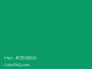 Hex #0b9b66 Color is a normal green color and the nearest color is Green Cyan #009966. Hex code #0b9b66 and RGB value is rgb(11,155,102). In RGB color space, this color is composed of 4% red, 61% green, 40% blue, In CMYK color space, this color is composed of 93% cyan, 0% magenta, 34% yellow , 39% black , In HSL color space, this color has a hue angle of 158° , 87% saturation and 33% lightness.