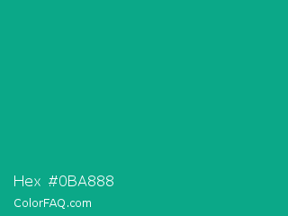 Hex #0ba888 Color is a normal cyan color and the nearest color is Niagara #06a189. Hex code #0ba888 and RGB value is rgb(11,168,136). In RGB color space, this color is composed of 4% red, 66% green, 53% blue, In CMYK color space, this color is composed of 93% cyan, 0% magenta, 19% yellow , 34% black , In HSL color space, this color has a hue angle of 168° , 88% saturation and 35% lightness.