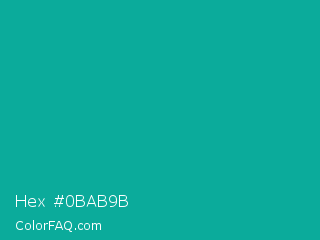 Hex #0bab9b Color is a normal cyan color and the nearest color is Persian Green #00a693. Hex code #0bab9b and RGB value is rgb(11,171,155). In RGB color space, this color is composed of 4% red, 67% green, 61% blue, In CMYK color space, this color is composed of 94% cyan, 0% magenta, 9% yellow , 33% black , In HSL color space, this color has a hue angle of 174° , 88% saturation and 36% lightness.