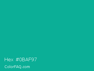 Hex #0baf97 Color is a normal cyan color and the nearest color is Persian Green #00a693. Hex code #0baf97 and RGB value is rgb(11,175,151). In RGB color space, this color is composed of 4% red, 69% green, 59% blue, In CMYK color space, this color is composed of 94% cyan, 0% magenta, 14% yellow , 31% black , In HSL color space, this color has a hue angle of 171° , 88% saturation and 36% lightness.