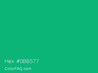 Hex #0bb577 Color is a normal green color and the nearest color is Green Munsell #00a877. Hex code #0bb577 and RGB value is rgb(11,181,119). In RGB color space, this color is composed of 4% red, 71% green, 47% blue, In CMYK color space, this color is composed of 94% cyan, 0% magenta, 34% yellow , 29% black , In HSL color space, this color has a hue angle of 158° , 89% saturation and 38% lightness.