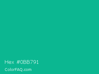 Hex #0bb791 Color is a normal cyan color and the nearest color is Mountain Meadow Crayola #1ab385. Hex code #0bb791 and RGB value is rgb(11,183,145). In RGB color space, this color is composed of 4% red, 72% green, 57% blue, In CMYK color space, this color is composed of 94% cyan, 0% magenta, 21% yellow , 28% black , In HSL color space, this color has a hue angle of 167° , 89% saturation and 38% lightness.
