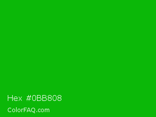 Hex #0bb808 Color is a normal green color and the nearest color is Islamic Green #009000. Hex code #0bb808 and RGB value is rgb(11,184,8). In RGB color space, this color is composed of 4% red, 72% green, 3% blue, In CMYK color space, this color is composed of 94% cyan, 0% magenta, 96% yellow , 28% black , In HSL color space, this color has a hue angle of 119° , 92% saturation and 38% lightness.