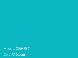 Hex #0bb8c1 Color is a normal cyan color and the nearest color is Tiffany Blue #0abab5. Hex code #0bb8c1 and RGB value is rgb(11,184,193). In RGB color space, this color is composed of 4% red, 72% green, 76% blue, In CMYK color space, this color is composed of 94% cyan, 5% magenta, 0% yellow , 24% black , In HSL color space, this color has a hue angle of 183° , 89% saturation and 40% lightness.