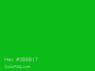 Hex #0bbb17 Color is a normal green color and the nearest color is Vivid Malachite #00cc33. Hex code #0bbb17 and RGB value is rgb(11,187,23). In RGB color space, this color is composed of 4% red, 73% green, 9% blue, In CMYK color space, this color is composed of 94% cyan, 0% magenta, 88% yellow , 27% black , In HSL color space, this color has a hue angle of 124° , 89% saturation and 39% lightness.