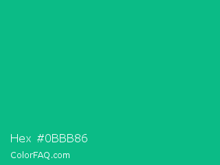 Hex #0bbb86 Color is a normal green color and the nearest color is Mountain Meadow Crayola #1ab385. Hex code #0bbb86 and RGB value is rgb(11,187,134). In RGB color space, this color is composed of 4% red, 73% green, 53% blue, In CMYK color space, this color is composed of 94% cyan, 0% magenta, 28% yellow , 27% black , In HSL color space, this color has a hue angle of 162° , 89% saturation and 39% lightness.