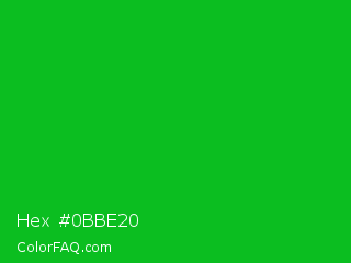 Hex #0bbe20 Color is a normal green color and the nearest color is Vivid Malachite #00cc33. Hex code #0bbe20 and RGB value is rgb(11,190,32). In RGB color space, this color is composed of 4% red, 75% green, 13% blue, In CMYK color space, this color is composed of 94% cyan, 0% magenta, 83% yellow , 25% black , In HSL color space, this color has a hue angle of 127° , 89% saturation and 39% lightness.