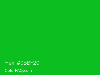 Hex #0bbf20 Color is a normal green color and the nearest color is Vivid Malachite #00cc33. Hex code #0bbf20 and RGB value is rgb(11,191,32). In RGB color space, this color is composed of 4% red, 75% green, 13% blue, In CMYK color space, this color is composed of 94% cyan, 0% magenta, 83% yellow , 25% black , In HSL color space, this color has a hue angle of 127° , 89% saturation and 40% lightness.