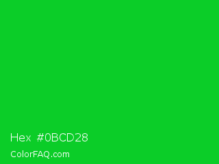 Hex #0bcd28 Color is a normal green color and the nearest color is Vivid Malachite #00cc33. Hex code #0bcd28 and RGB value is rgb(11,205,40). In RGB color space, this color is composed of 4% red, 80% green, 16% blue, In CMYK color space, this color is composed of 95% cyan, 0% magenta, 80% yellow , 20% black , In HSL color space, this color has a hue angle of 129° , 90% saturation and 42% lightness.
