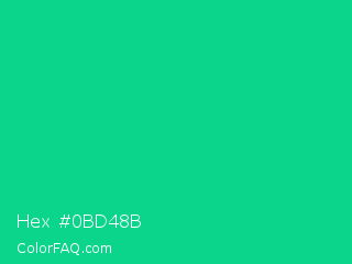 Hex #0bd48b Color is a normal green color and the nearest color is Caribbean Green #00cc99. Hex code #0bd48b and RGB value is rgb(11,212,139). In RGB color space, this color is composed of 4% red, 83% green, 55% blue, In CMYK color space, this color is composed of 95% cyan, 0% magenta, 34% yellow , 17% black , In HSL color space, this color has a hue angle of 158° , 90% saturation and 44% lightness.