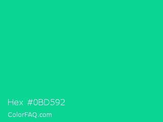 Hex #0bd592 Color is a normal green color and the nearest color is Caribbean Green #00cc99. Hex code #0bd592 and RGB value is rgb(11,213,146). In RGB color space, this color is composed of 4% red, 84% green, 57% blue, In CMYK color space, this color is composed of 95% cyan, 0% magenta, 31% yellow , 16% black , In HSL color space, this color has a hue angle of 160° , 90% saturation and 44% lightness.