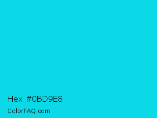 Hex #0bd9e8 Color is a normal cyan color and the nearest color is Bright Turquoise #08e8de. Hex code #0bd9e8 and RGB value is rgb(11,217,232). In RGB color space, this color is composed of 4% red, 85% green, 91% blue, In CMYK color space, this color is composed of 95% cyan, 6% magenta, 0% yellow , 9% black , In HSL color space, this color has a hue angle of 184° , 91% saturation and 48% lightness.