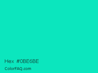 Hex #0be6be Color is a normal cyan color and the nearest color is Robins Egg Blue #00cccc. Hex code #0be6be and RGB value is rgb(11,230,190). In RGB color space, this color is composed of 4% red, 90% green, 75% blue, In CMYK color space, this color is composed of 95% cyan, 0% magenta, 17% yellow , 10% black , In HSL color space, this color has a hue angle of 169° , 91% saturation and 47% lightness.