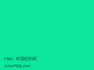 Hex #0be89e Color is a normal green color and the nearest color is Medium Spring Green #00fa9a. Hex code #0be89e and RGB value is rgb(11,232,158). In RGB color space, this color is composed of 4% red, 91% green, 62% blue, In CMYK color space, this color is composed of 95% cyan, 0% magenta, 32% yellow , 9% black , In HSL color space, this color has a hue angle of 160° , 91% saturation and 48% lightness.