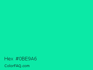 Hex #0be9a6 Color is a normal green color and the nearest color is Medium Spring Green #00fa9a. Hex code #0be9a6 and RGB value is rgb(11,233,166). In RGB color space, this color is composed of 4% red, 91% green, 65% blue, In CMYK color space, this color is composed of 95% cyan, 0% magenta, 29% yellow , 9% black , In HSL color space, this color has a hue angle of 162° , 91% saturation and 48% lightness.