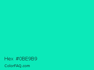 Hex #0be9b9 Color is a normal cyan color and the nearest color is Robins Egg Blue #00cccc. Hex code #0be9b9 and RGB value is rgb(11,233,185). In RGB color space, this color is composed of 4% red, 91% green, 73% blue, In CMYK color space, this color is composed of 95% cyan, 0% magenta, 21% yellow , 9% black , In HSL color space, this color has a hue angle of 167° , 91% saturation and 48% lightness.
